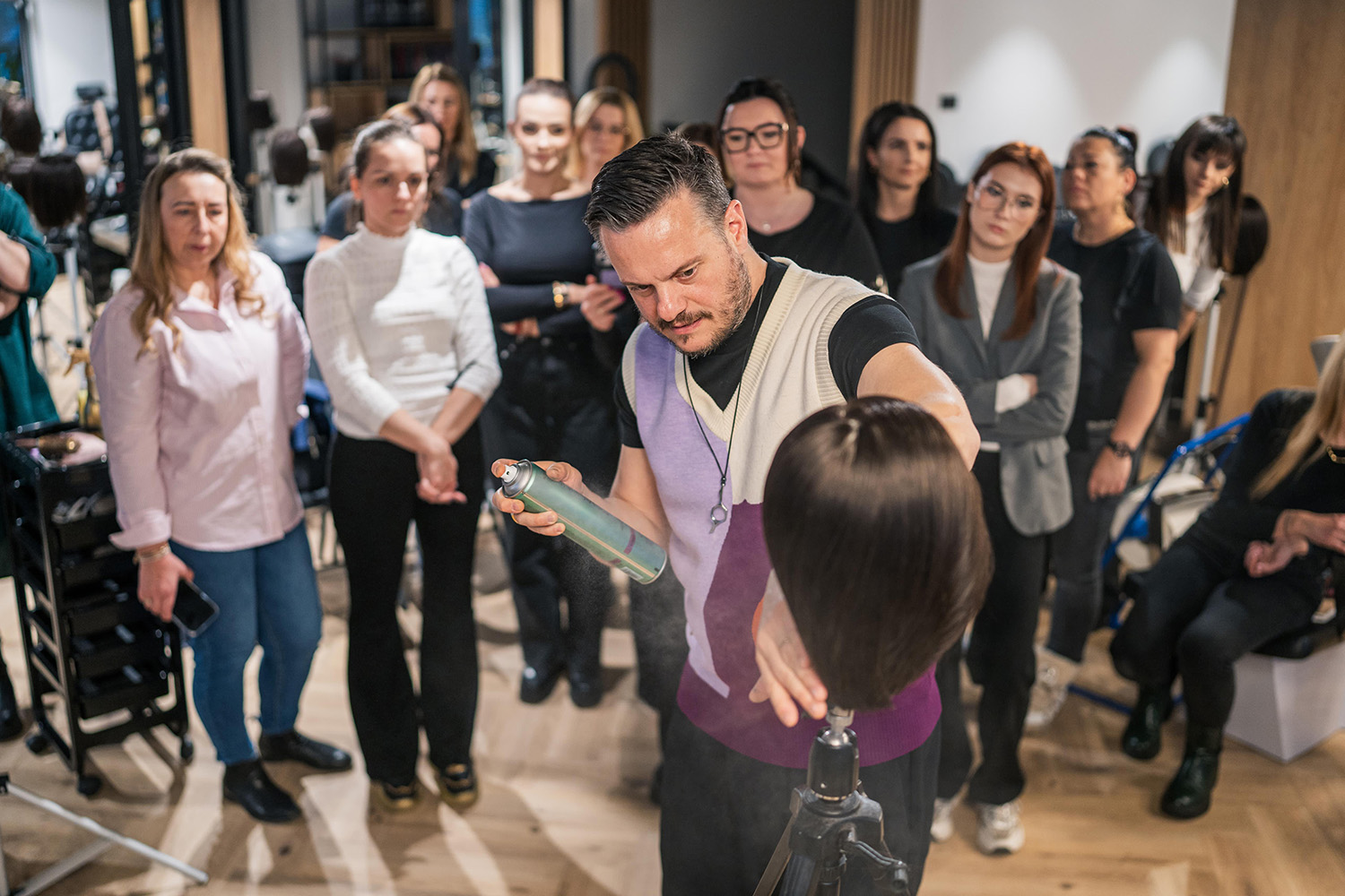 Fryzjerzy skupieni wokół Akademii mieli również możliwość spotkań z Oleną Kotułą, uznaną stylistką fryzur i zdobywczynią wielu tytułów Mistrzyni Świata oraz Polski, która dzieliła się wiedzą dotyczącą perfekcyjnych stylizacji fryzur na różnym poziomie.