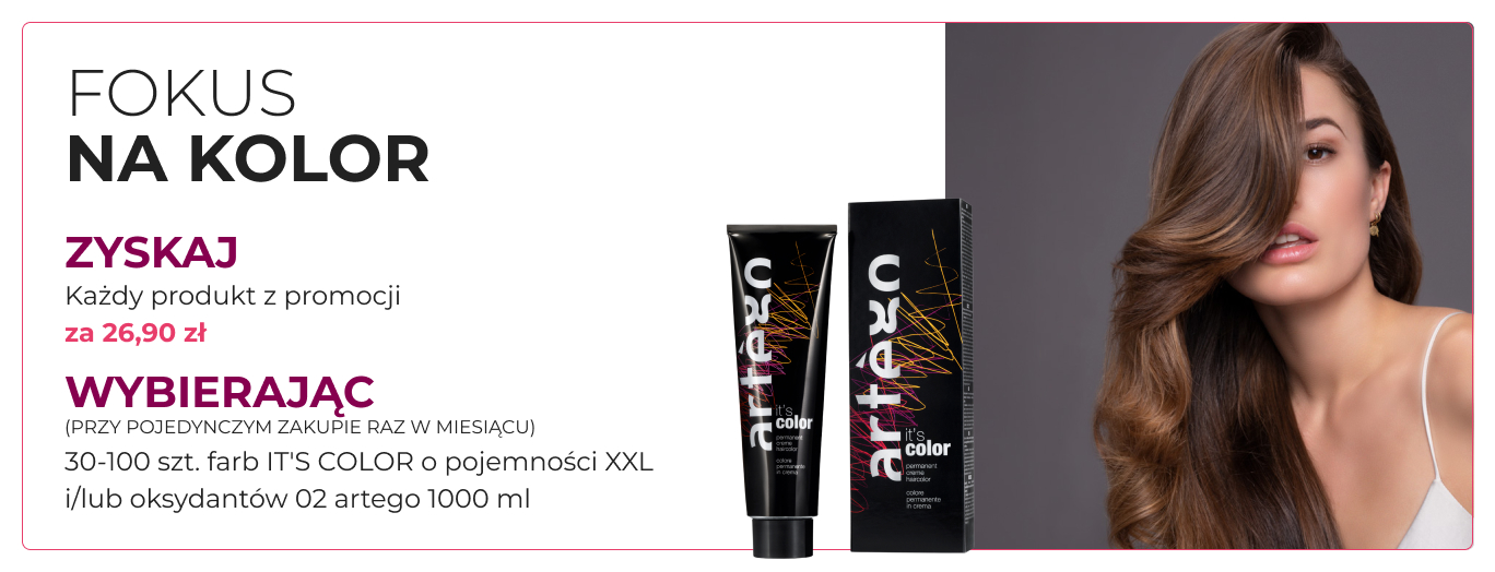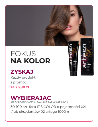Przy jednorazowym zakupie minimum 30 sztuk i maksimum 100 sztuk Towaru promowanego (tj. farb do włosów marki artego z serii „It’s Color” i/lub oksydantów O2 1000ml pkt.3), Klient otrzymuje możliwość nabycia powyższych artykułów w cenie 26,90zł za sztukę. Uczestnik może skorzystać z akcji promocyjnej raz w miesiącu.