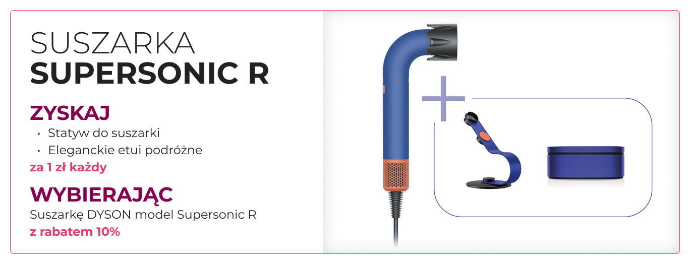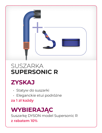 W czasie trwania Akcji Promocyjnej, przy zakupie suszarki Dyson Supersonic R, uczestnik otrzymuje rabat 10% na suszarkę oraz możliwość zakupu etui podróżnego marki Dyson o wartości 350 zł za 1 zł brutto i statywu do suszarki o wartości 300 zł za 1 zł brutto.