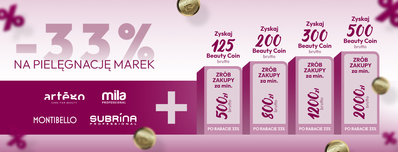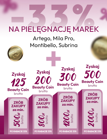 Dodaj do koszyka produkty do pielęgnacji marek Artego, Mila Pro, Montibello, Subrina o wartości co najmniej 500/800/1200/2000 zł brutto (po rabacie -33%).