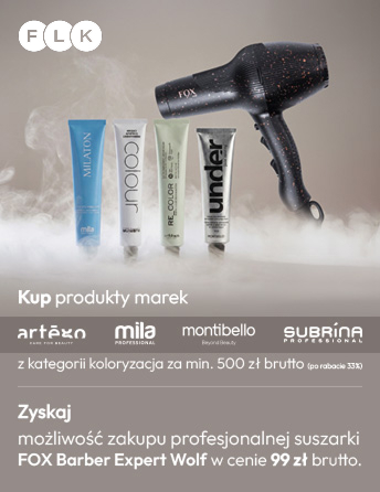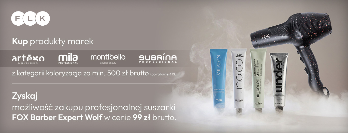 Koloryzacja to fundament pracy w każdym salonie fryzjerskim – generuje obrót, buduje lojalność klientek i jest podstawą codziennej pracy stylisty. Teraz możesz zyskać jeszcze więcej. Kup produkty do koloryzacji marek Artego, Montibello, Mila lub Subrina za minimum 500 zł brutto (po rabacie 33%) i zyskaj możliwość zakupu suszarki FOX Marine w wyjątkowej cenie 99 zł brutto. Wykorzystaj budżet, który i tak przeznaczasz na zatowarowanie salonu, i odbierz profesjonalny sprzęt. Liczba suszarek jest ograniczona.
