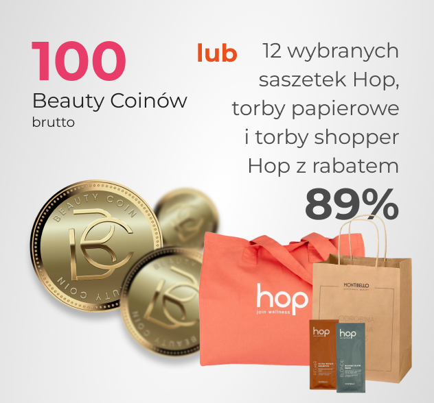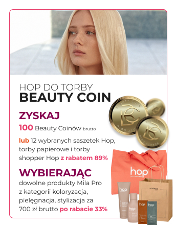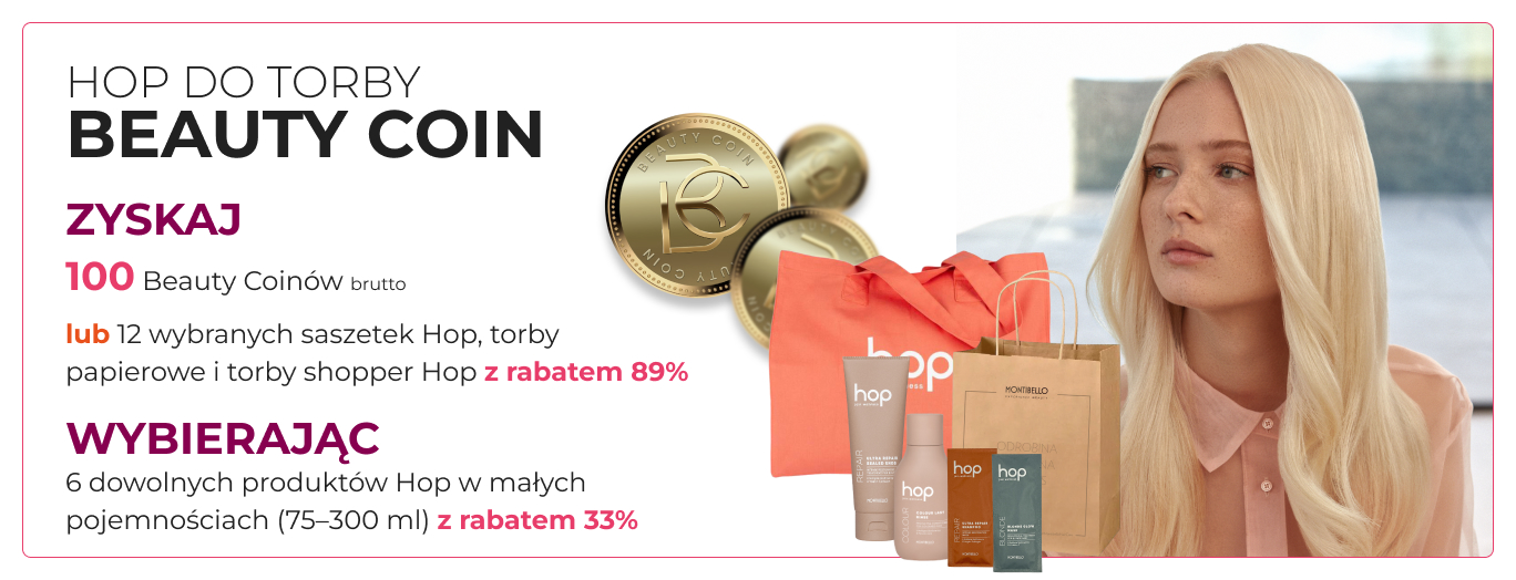 Promocja HOP DO TORBY wspiera sprzedaż detaliczną i pielęgnację domową klientek. Po skompletowaniu 6 produktów Hop w małych pojemnościach (75–300 ml) możesz wybrać w koszyku jedną z dostępnych opcji promocyjnych. W zależności od wybranego wariantu otrzymasz 100 Beauty Coiny do wykorzystania na produkty objęte programem na platformie Fale Loki Koki. To elastyczne rozwiązanie, które pozwala dopasować korzyść do aktualnych potrzeb salonu.