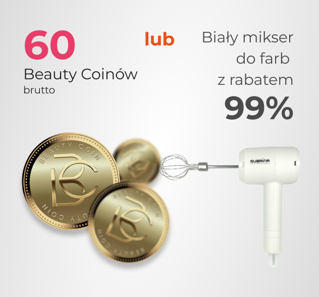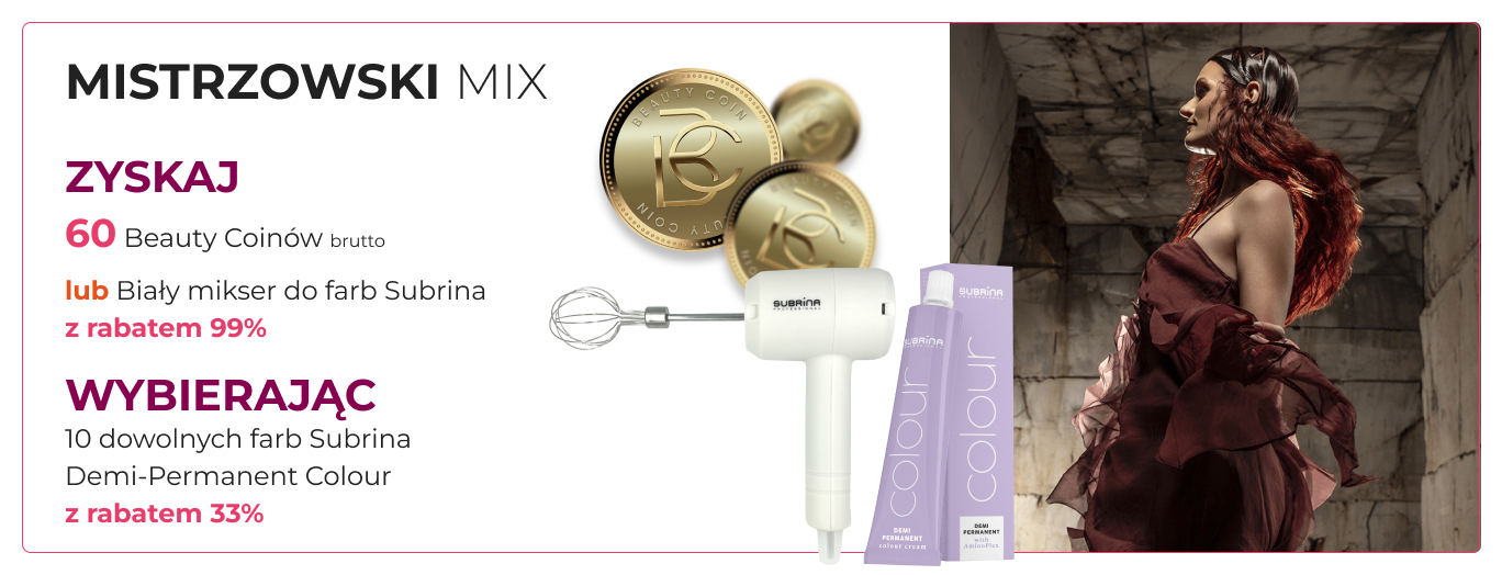 Kupując 10 dowolnych tonerów Demi-Permanent Subrina Professional 60 ml z 33% rabatem otrzymasz biały mikser do farb Subrina z 99% rabatem albo 60 Beauty Coinów do wykorzystania na produkty objęte programem na platformie Fale Loki Koki. Akcja Promocyjna przeznaczona jest dla Klientów, będących Salonami Fryzjerskimi.