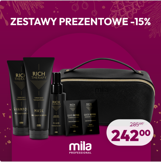 • Skład: szampon 250 ml, maska 250 ml, mleczko 250 ml, kosmetyczka + kartonik